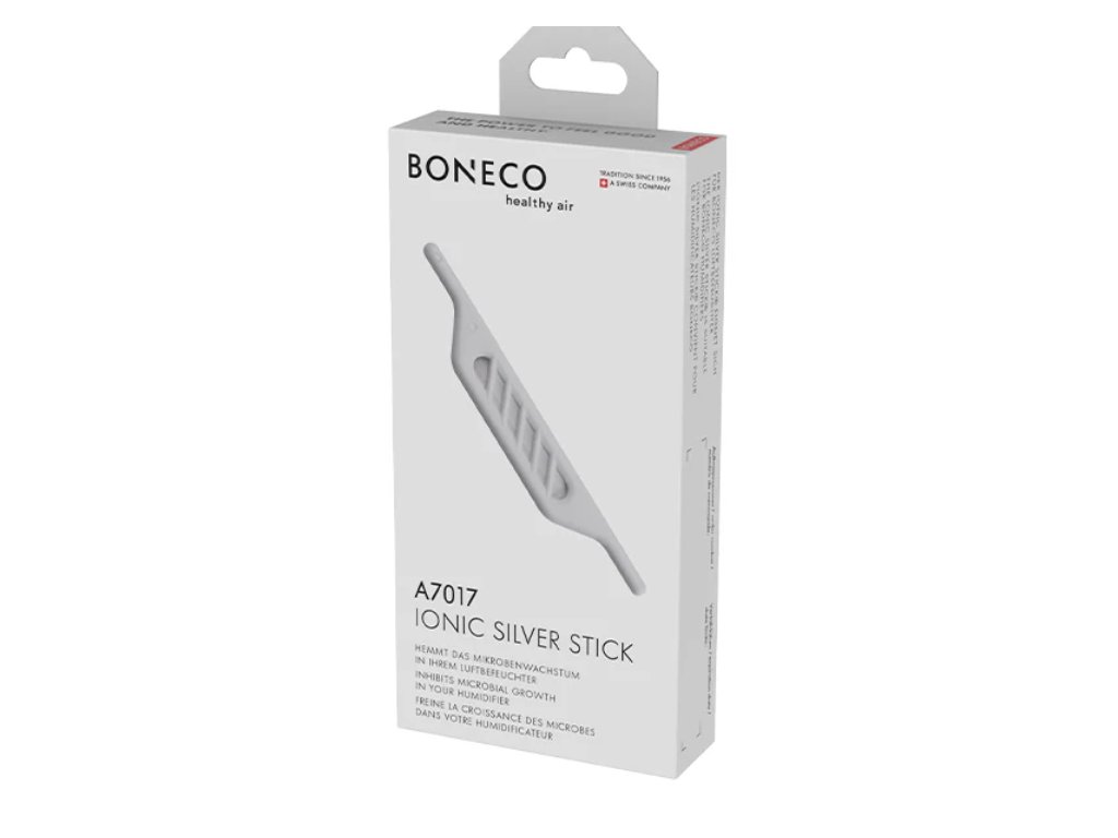 Der ionisierende Silberstab (ISS) BONECO A7017 hält das Wasser in den Luftbefeuchtern hygienisch sauber und unbedenklich. Er verhindert das Entstehen und Wachstum von Bakterien und Mikroorganismen. Er basiert auf dem Prinzip der antimikrobiellen Eigenschaften von Silber. Er befreit das Wasser von mehr als 650 Bakterienarten. Für seine Funktion benötigt er weder elektrische Energie noch eine chemische Reaktion. Es genügt, ihn in das Wasser im Inneren des Luftbefeuchters zu legen. Die Lebensdauer des Stabs beträgt 1 Jahr bei voller Wirksamkeit.