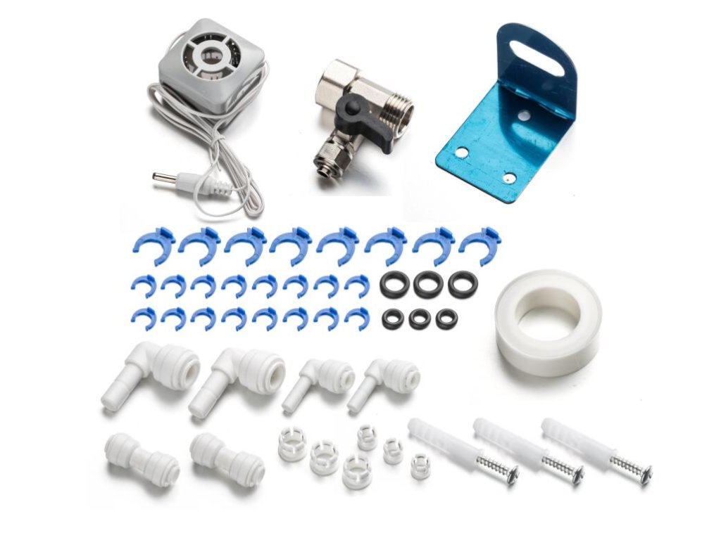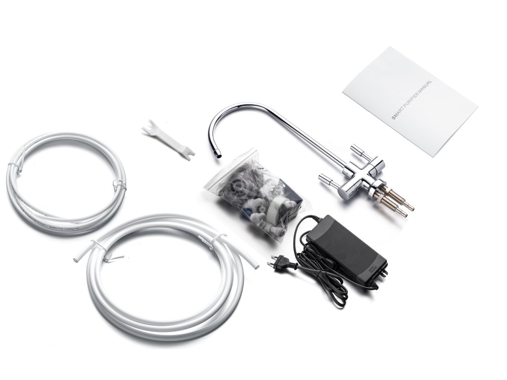 Zwei-Wege-Wasserhahn: Das Paket enthält einen Wasserhahn mit zwei Ausgängen zur Auswahl von gefiltertem Wasser mit niedrigerer oder höherer Mineralisierung.